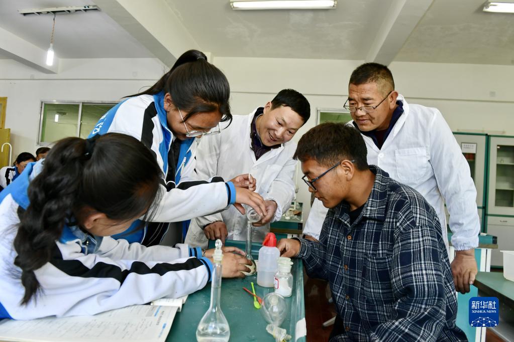 在西藏山南市第一高级中学,来自湖北襄阳的援藏老师蔡春亭(中)和本地老师次仁曲旦(右后)指导学生做化学实验(2019年5月7日摄)。新华社记者 张汝锋 摄