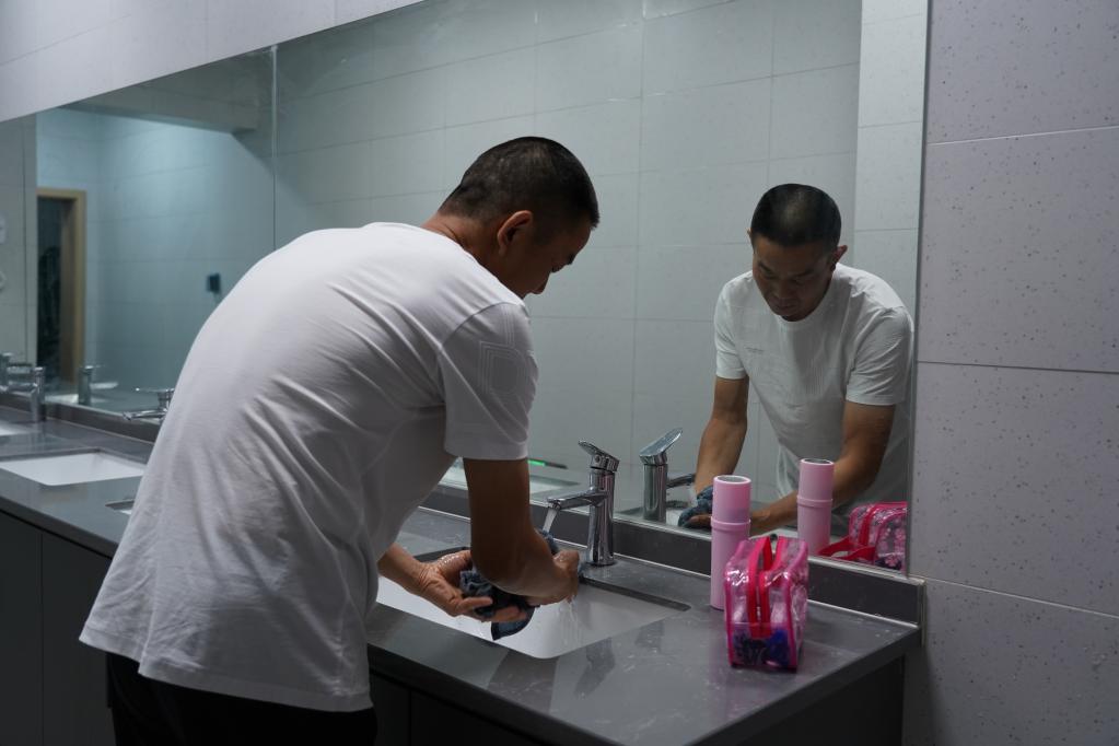 谢师傅在彭州市“暖心之家”驿站内洗漱休息(8月4日摄)。新华社记者 刘琼 摄