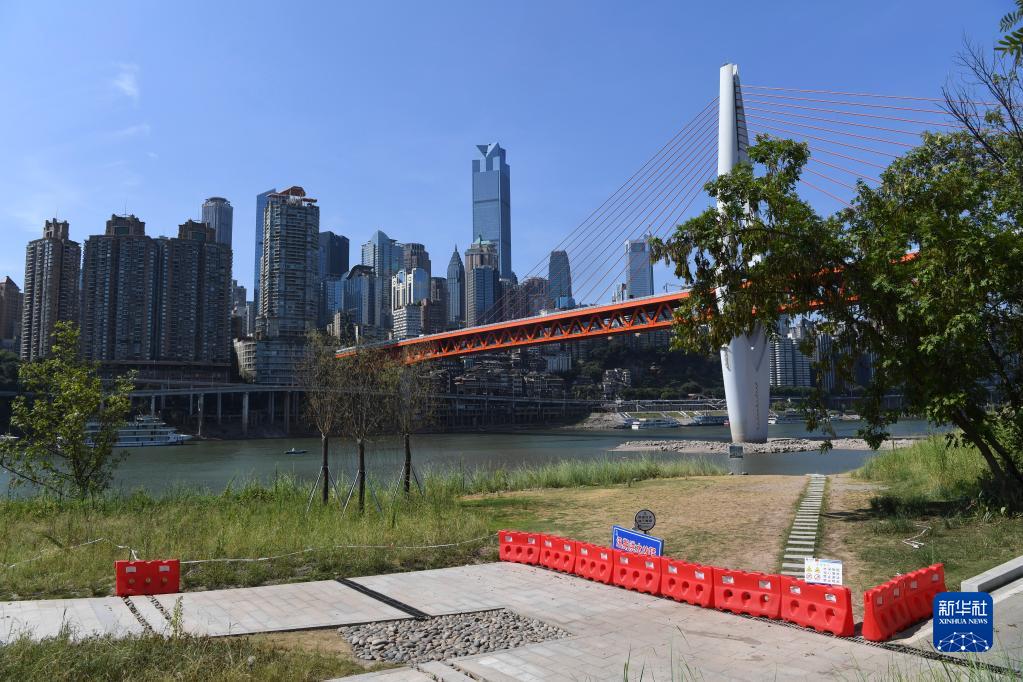 这是8月17日拍摄的重庆嘉陵江江北江滩公园一带景象。提前布置好的防汛相关设施没有派上用场。