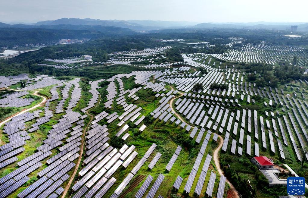 空中俯瞰陕西洛南的“光伏农场”(8月19日摄,无人机照片)。