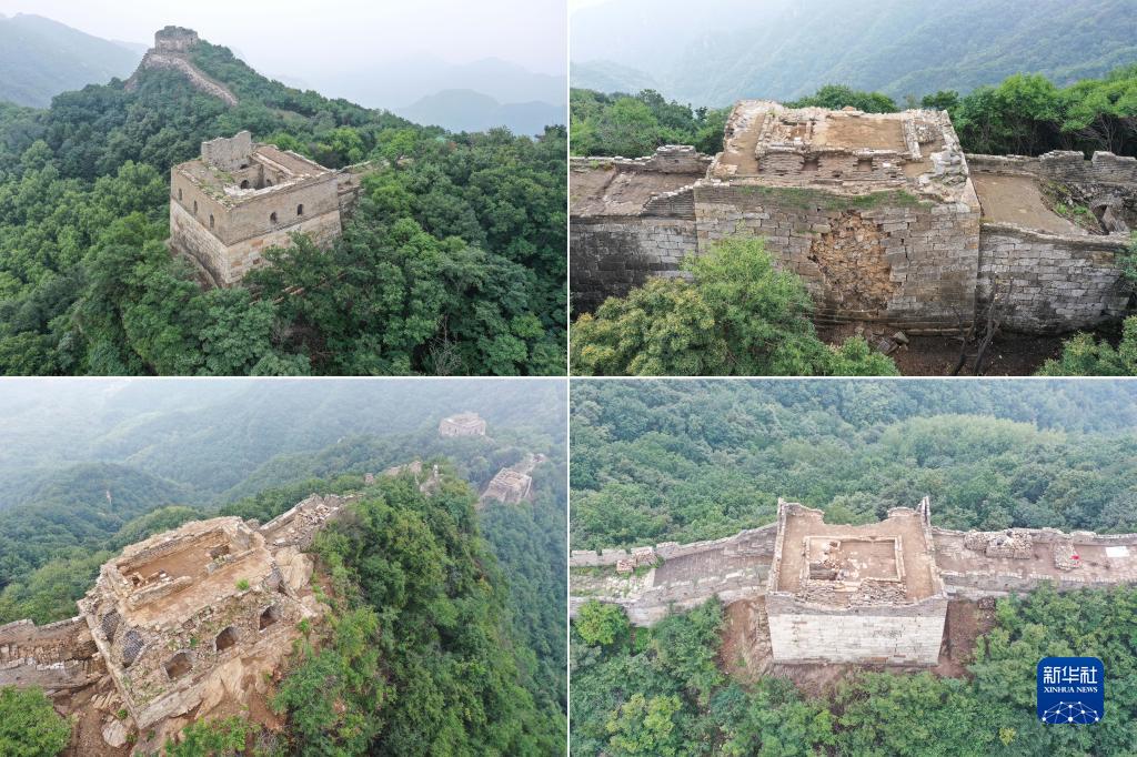 这是研究性修缮段的几个敌台的拼版照片:左上为正在进行考古发掘的142号敌台;右上为已完成考古发掘的143号敌台;左下为已完成考古发掘的144号敌台;右下为已完成考古发掘的145号敌台(8月17日摄,无人机照片)。