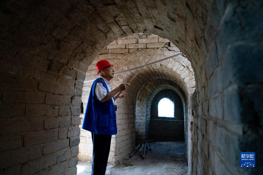 工程师程永茂在“西大墙”段158号敌台巡视,经老砖修复,敌台内的券洞恢复旧貌(8月16日摄)。