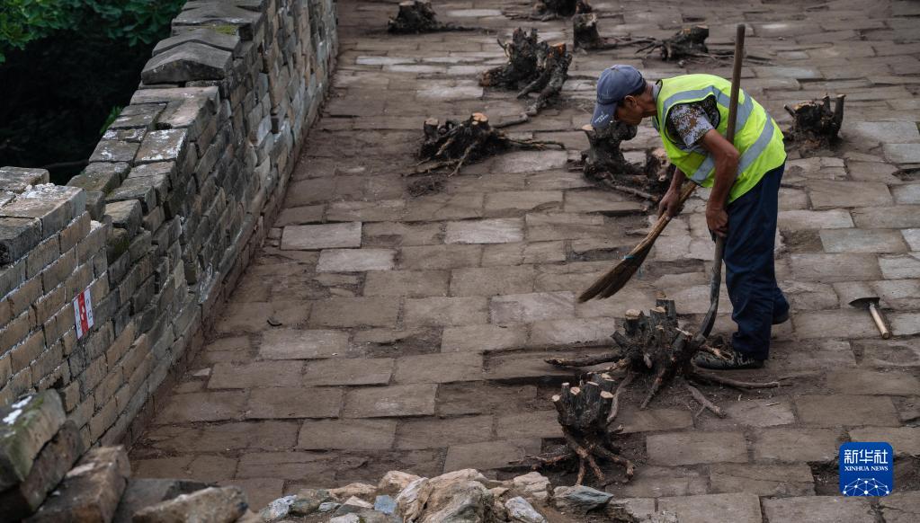 工人在研究性修缮考古发掘过程中保留了树根,以对长城植物病害作进一步研究(8月17日摄)。