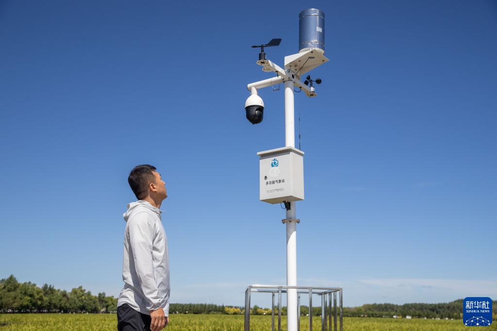8月20日,工作人员在北大荒集团闫家岗农场有限公司农业现代化示范区内检查基于5G网络支持下的多功能气象站。