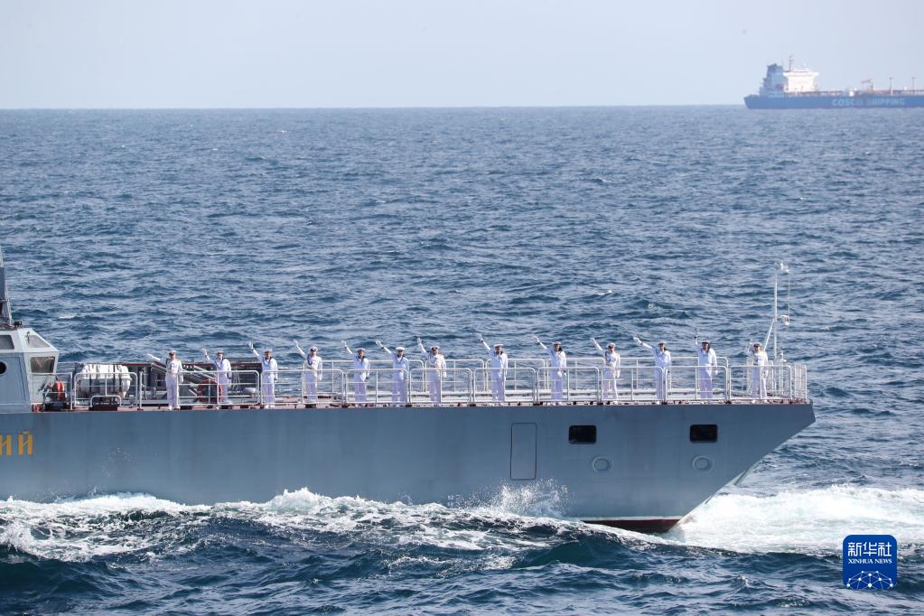 8月20日,“国际军事比赛-2022”“海洋之杯”比赛在山东青岛附近海域闭幕,中方官兵向俄方挥手告别。新华社发(袁波 摄)