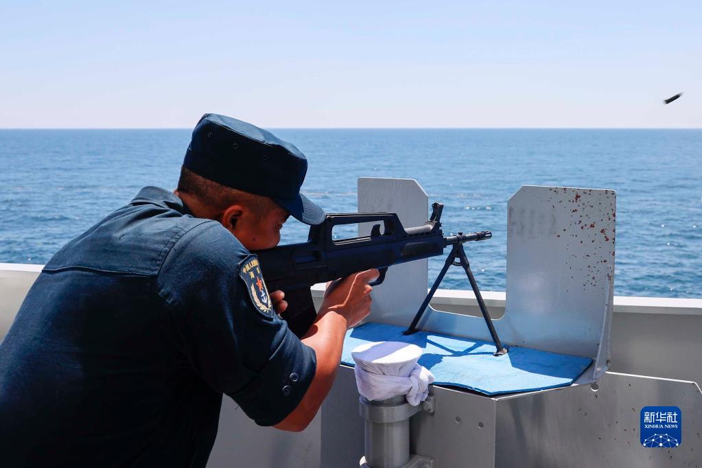8月17日至20日,“国际军事比赛-2022”“海洋之杯”比赛在山东青岛附近海域进行。这是中方参赛舰临沂舰官兵在反恐反海盗比赛课目中射击靶标(8月17日摄)。新华社发(刘再耀 摄)