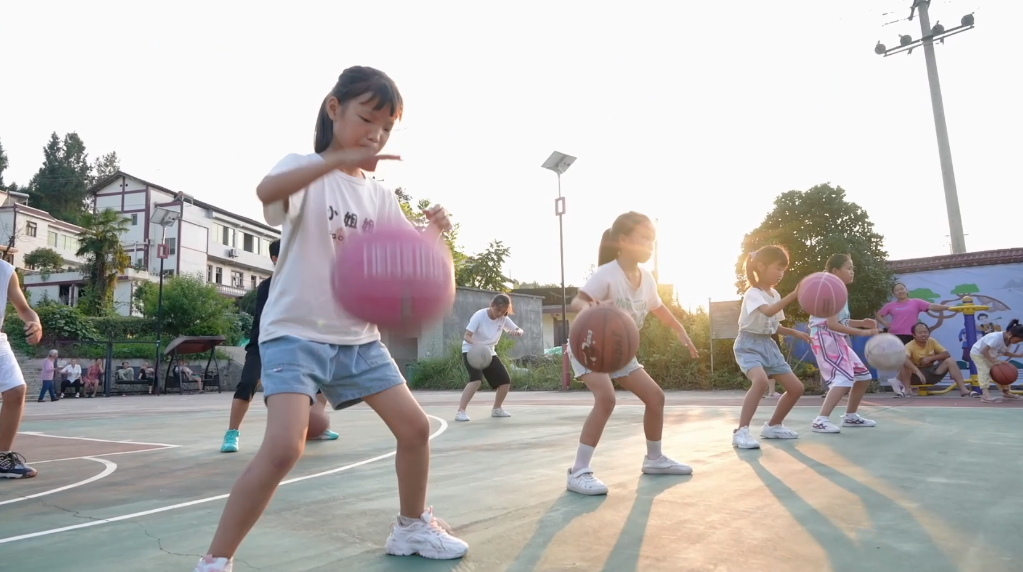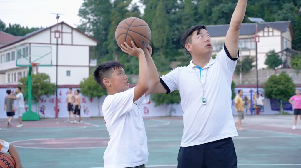 在贵州省遵义市红花岗区深溪镇清江村,为了让孩子们健康快乐过暑假,驻村工作队开办免费培训班,第一书记带队教孩子们打篮球。
