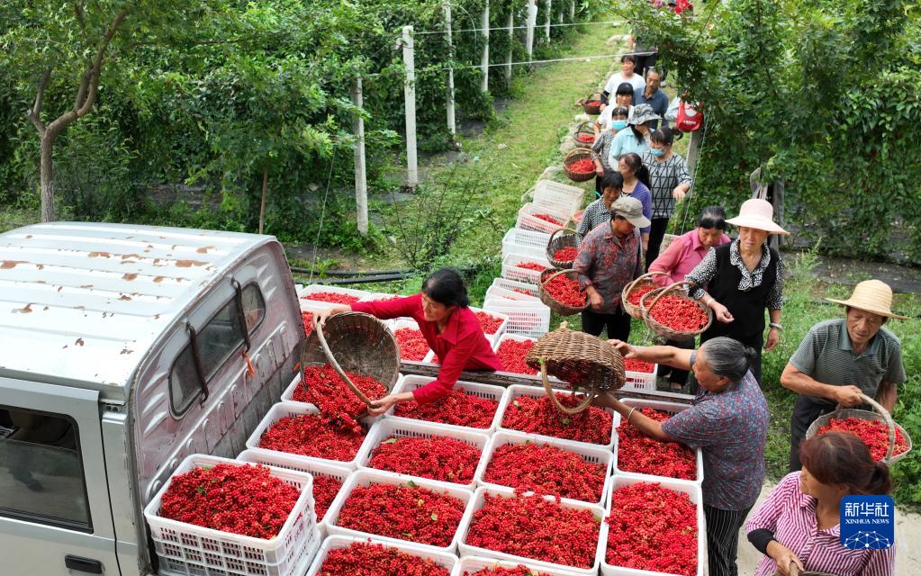 8月21日,洛南县煜正中药材专业合作社的员工将采摘的五味子统一装车运往加工车间。