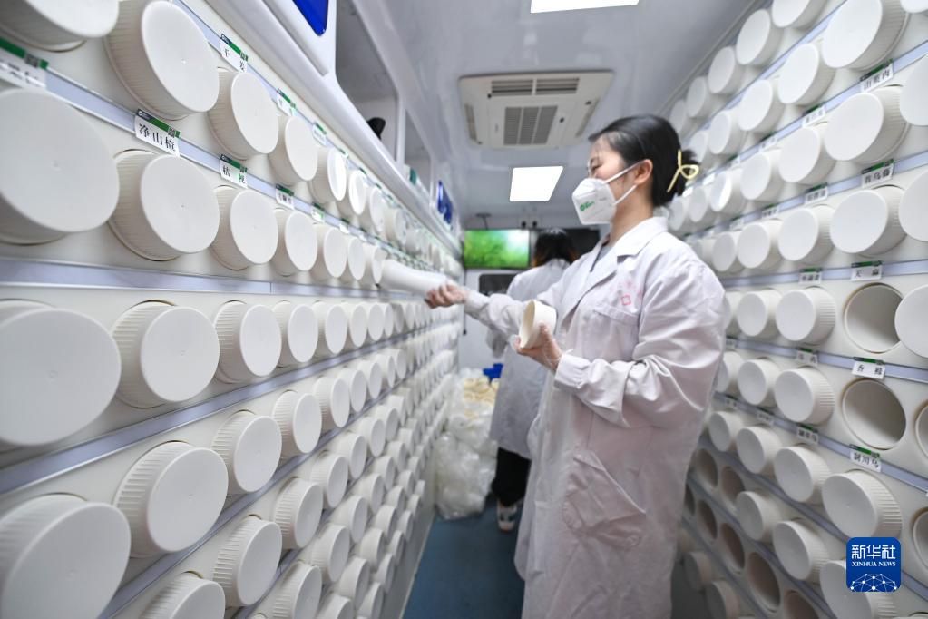 8月20日,在来自四川的“流动应急智能中药房”里,工作人员将盛有单味中药浓缩颗粒的药瓶取下准备制药。
