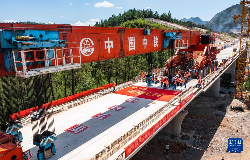这是宣绩铁路站前二标首孔箱梁架设现场(8月21日摄,无人机照片)。