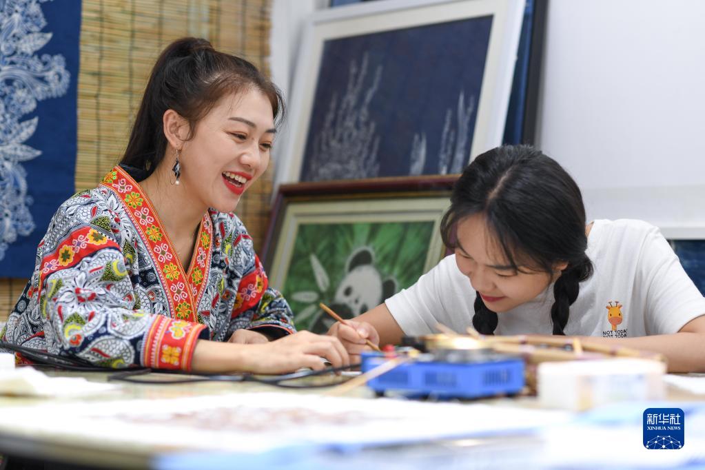 张娟娟(左)在蜡染体验工作室里指导妹妹绘制蜡版画(8月18日摄)。