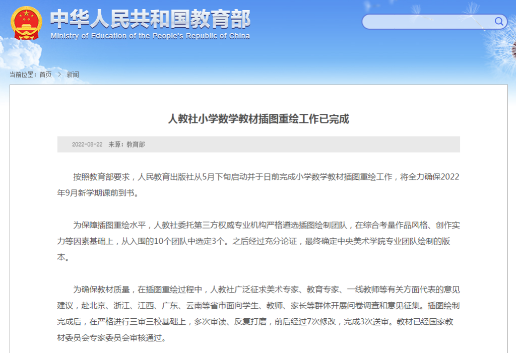 记者8月22日从教育部获悉,按照教育部要求,人民教育出版社从5月下旬启动并于日前完成小学数学教材插图重绘工作,将全力确保2022年9月新学期课前到书。