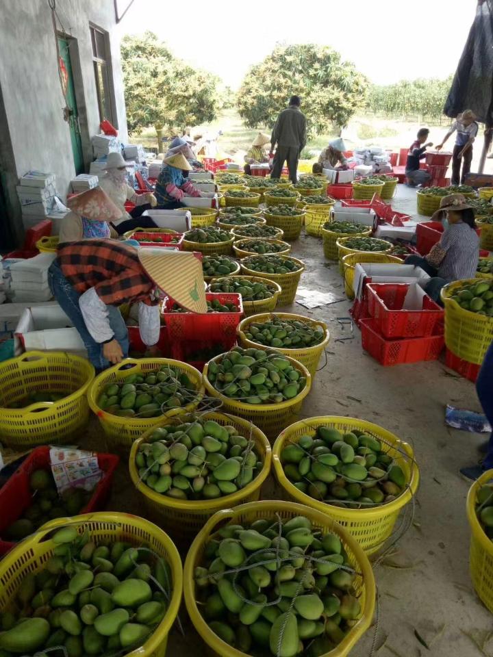 图为乐东县黄流镇佛老村村民在车间挑拣芒果并装箱。
