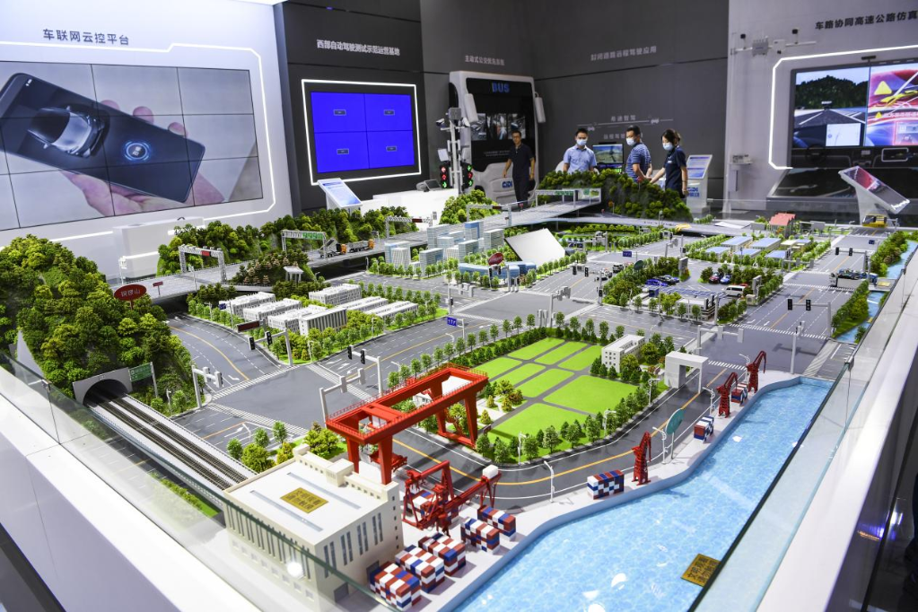 8月21日,嘉宾在2022中国国际智能产业博览会会场参观车路协同沙盘。新华社记者 王全超 摄