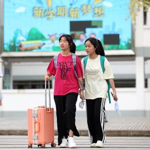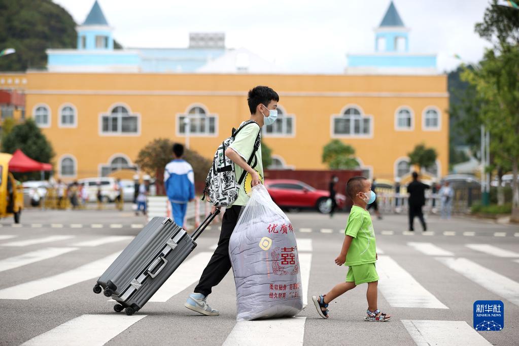 8月22日,在贵州省黔东南苗族侗族自治州丹寨县第二中学,初一年级新生(左)在弟弟的陪伴下前往报到处。