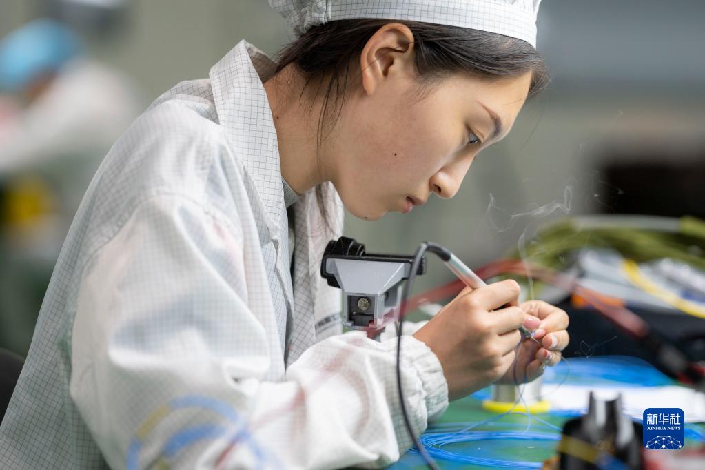 2022年8月3日,在长光卫星技术股份有限公司电装车间,陈茂胜团队成员、电装操作员田雪君在制作电缆。