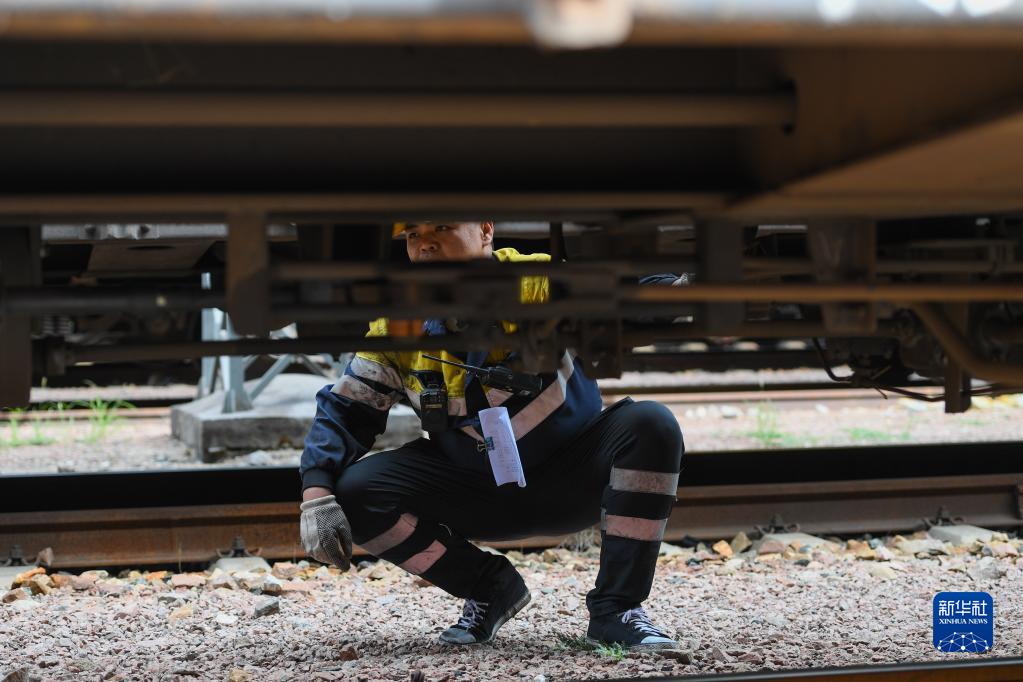 8月22日,在乌海西站编组场,调车员在检查车底设备。