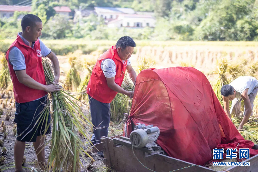 在潼南区,乡村振兴驻村干部顶着烈日,帮助当地村民收割水稻、打谷子。新华网 发