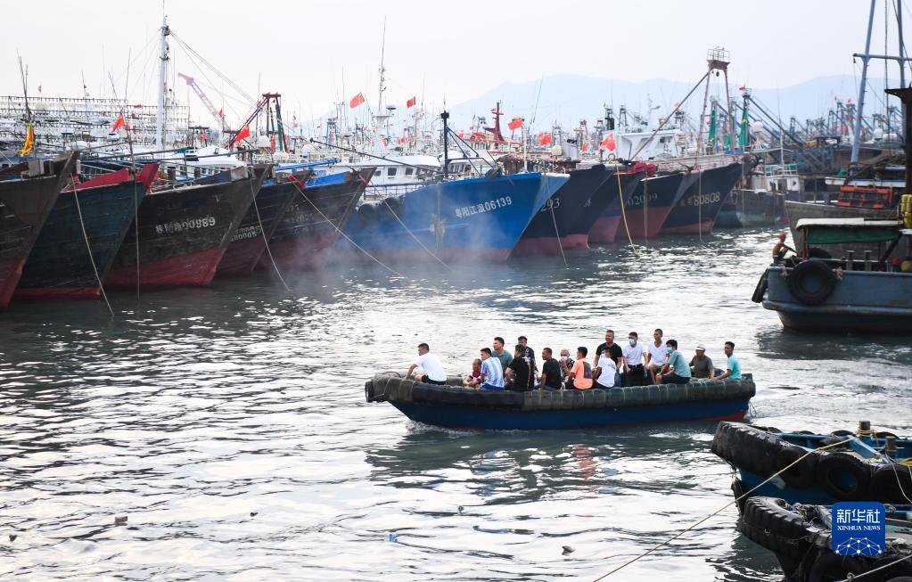 8月24日,在广东阳江市海陵岛闸坡国家级中心渔港,海上从业人员搭乘小艇靠岸。