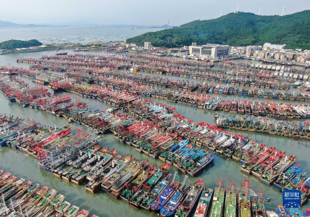 8月24日,在广东阳江市海陵岛闸坡国家级中心渔港,停满了归港避风的渔船(无人机照片)。