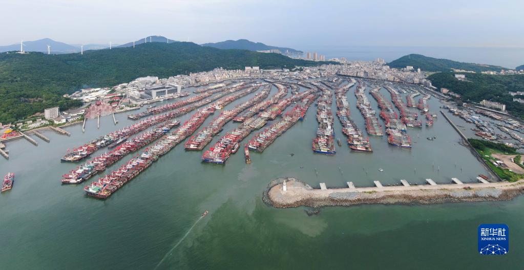 8月24日,在广东阳江市海陵岛闸坡国家级中心渔港,停满了归港避风的渔船(无人机照片)。