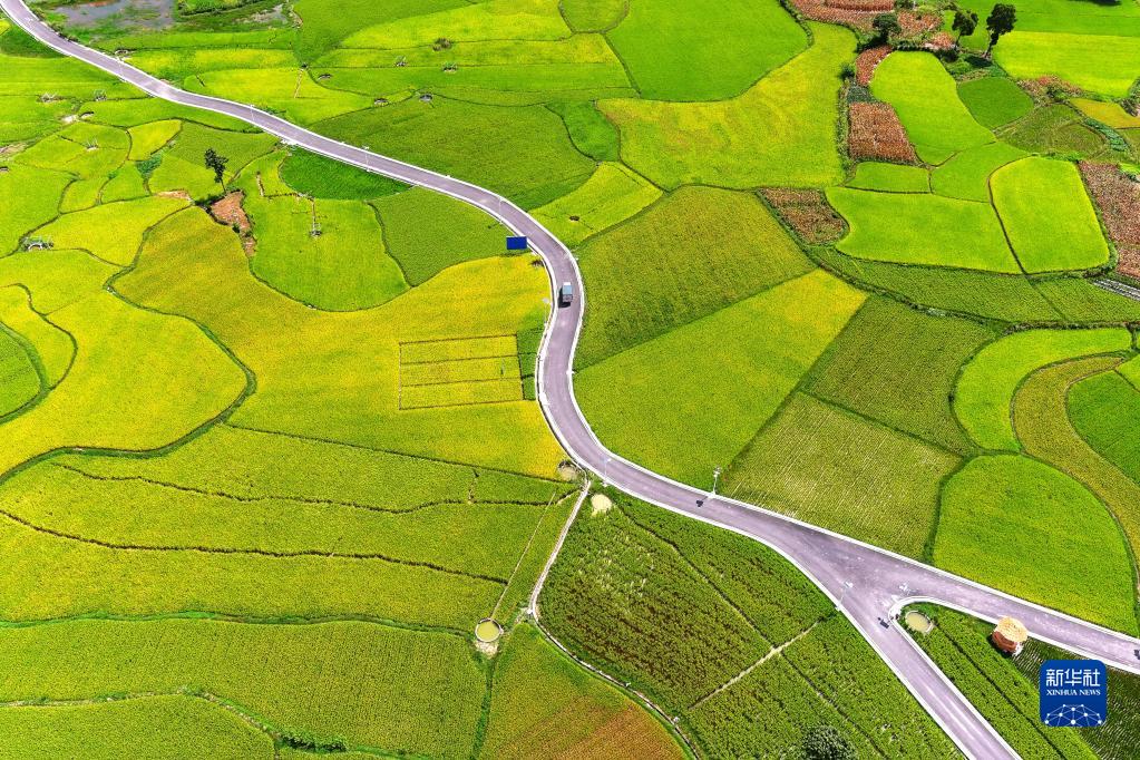 时下,贵州高原各地水稻长势喜人,陆续进入成熟期,金灿灿的层层稻田与民居、公路、河流、山峦等相映成景,构成一幅幅迷人的高原乡村田园画卷。