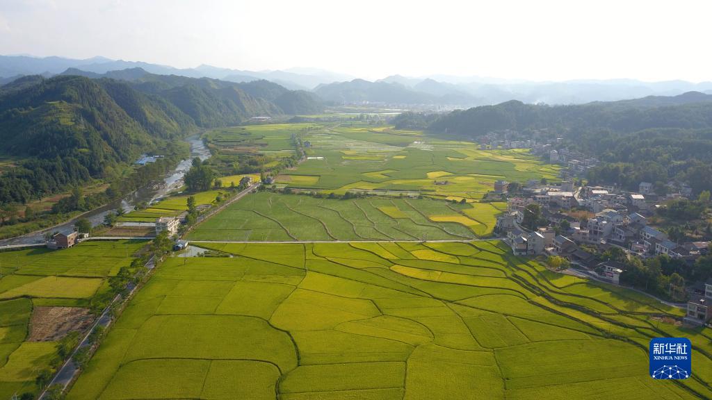 时下,贵州高原各地水稻长势喜人,陆续进入成熟期,金灿灿的层层稻田与民居、公路、河流、山峦等相映成景,构成一幅幅迷人的高原乡村田园画卷。