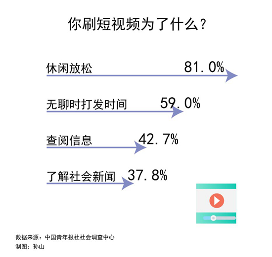 调查中,81.0%的受访者表示刷短视频是为了休闲放松。其他还有:无聊时打发时间(59.0%)、查阅信息(42.7%)、了解社会新闻(37.8%)等。