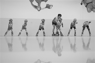 小朋友在河北省邢台市内丘县一家轮滑俱乐部参加轮滑训练。新华社发(刘继东 摄)