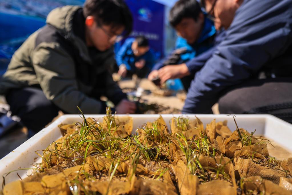 2021年4月13日,中国水产科学研究院黄海水产研究所近海生态养殖团队与山东荣成楮岛水产有限公司联合开展的鳗草(海草)幼苗培育项目。(李信君摄)