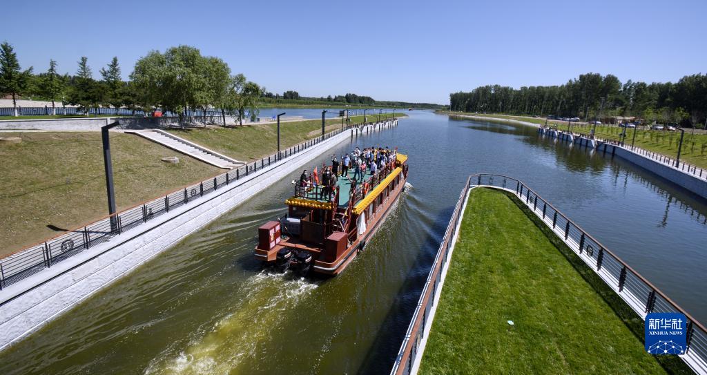 资料图片:6月24日,载着北京游客和建设者代表的游船通过船闸进入京杭大运河河北段。新华社记者 李欣 摄
