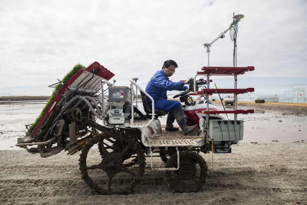 2021年5月11日,工作人员操作无人驾驶插秧机准备作业。