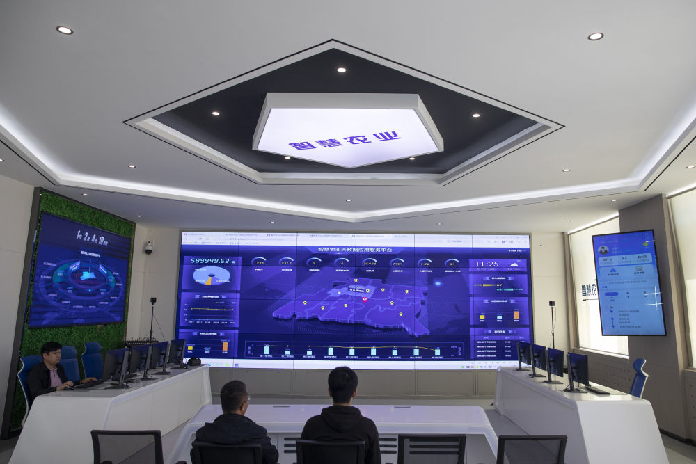 2021年5月11日,在智慧农业指挥中心,工作人员查询无人驾驶插秧机的工作情况。