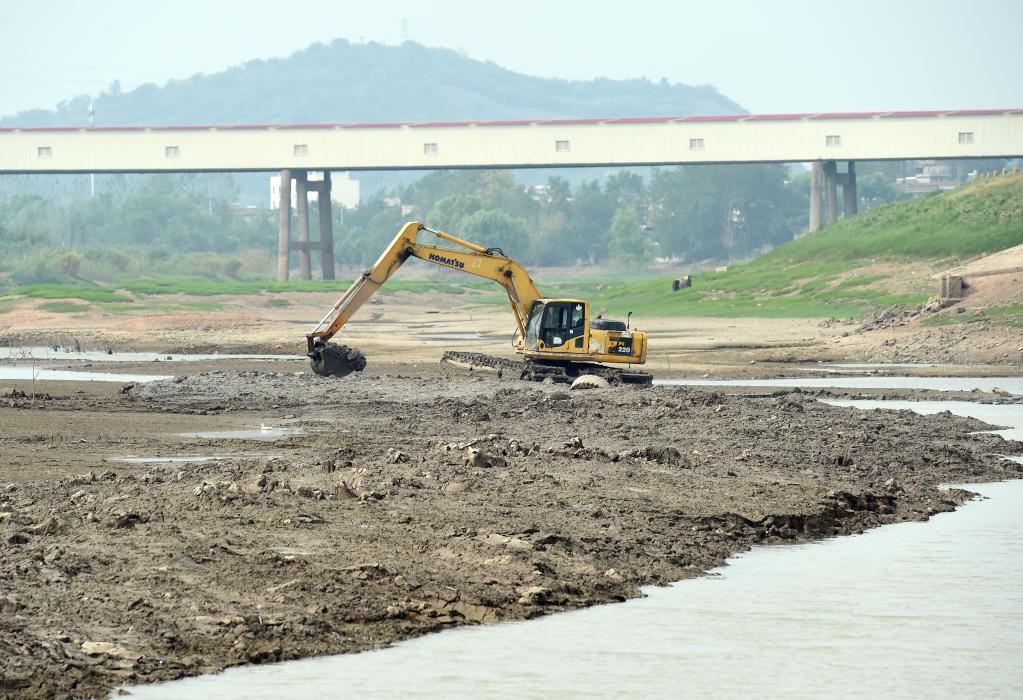 8月23日,在安徽省芜湖市繁昌区荻港镇,水上挖掘机在河道里进行清淤作业,疏通引水渠道。新华社记者 周牧 摄