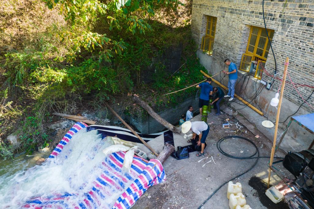 8月15日,在湖南省桃源县热市镇郭家垭村,乡镇水利站工作人员在取水点安装抽水设备(无人机照片)。新华社记者 陈思汗 摄