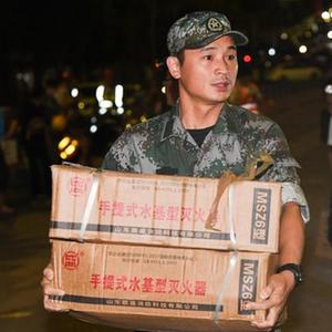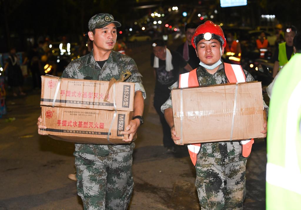 8月26日凌晨,救援人员在搬运灭火器。新华社记者 王全超 摄
