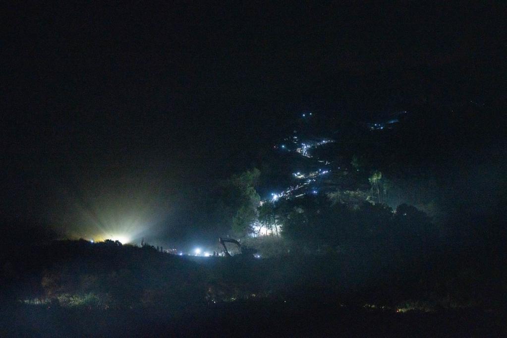 8月26日凌晨,救援人员仍在向山上运送物资。新华社记者 朱高祥 摄