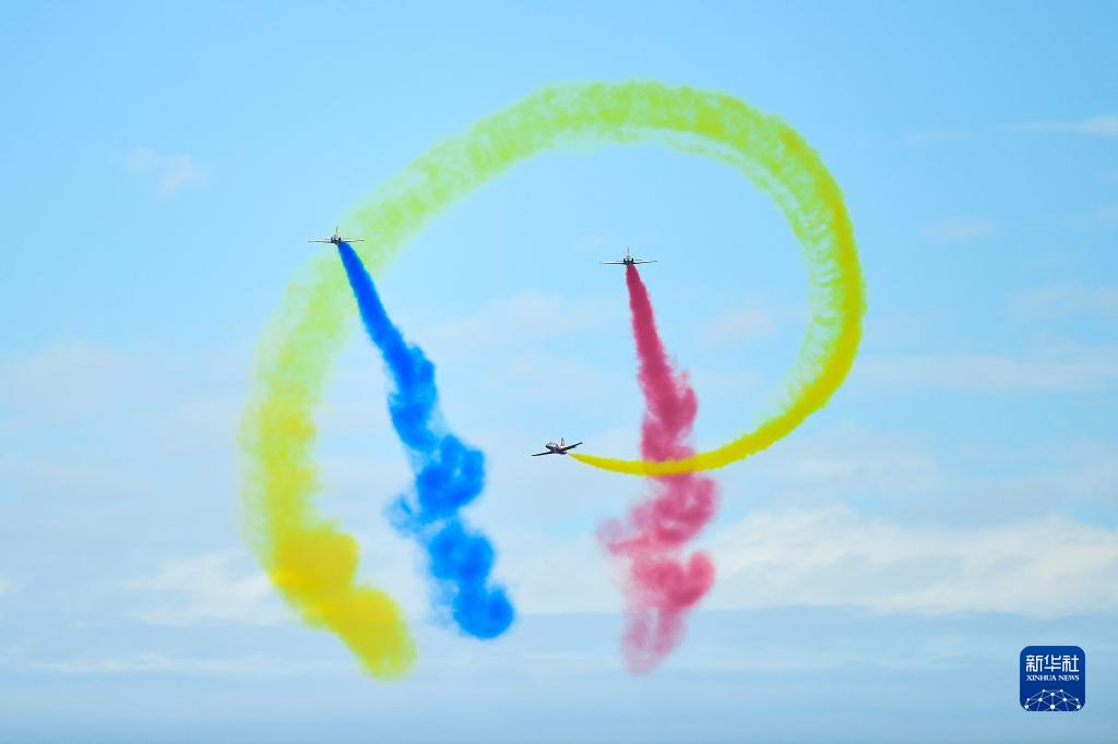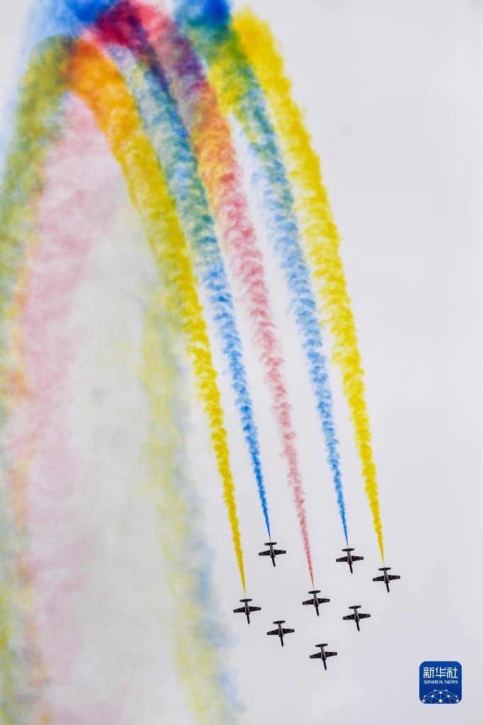 8月26日,在空军航空开放活动暨长春航空展上,空军航空大学“天之翼”飞行表演队编队飞行。新华社发(时旭琛 摄)