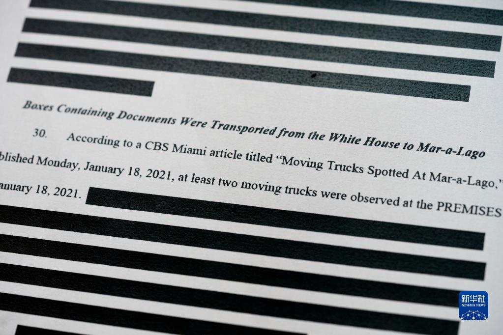 这是8月26日拍摄的美国联邦调查局申请搜查前总统特朗普住所海湖庄园时向法院提交书面证词的部分内容。