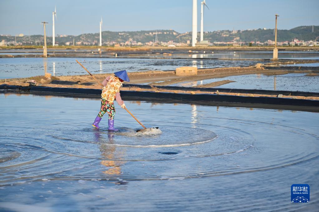 8月26日,在福建省莆田市秀屿区东峤镇的莆田盐场,工人在盐田里扒盐。