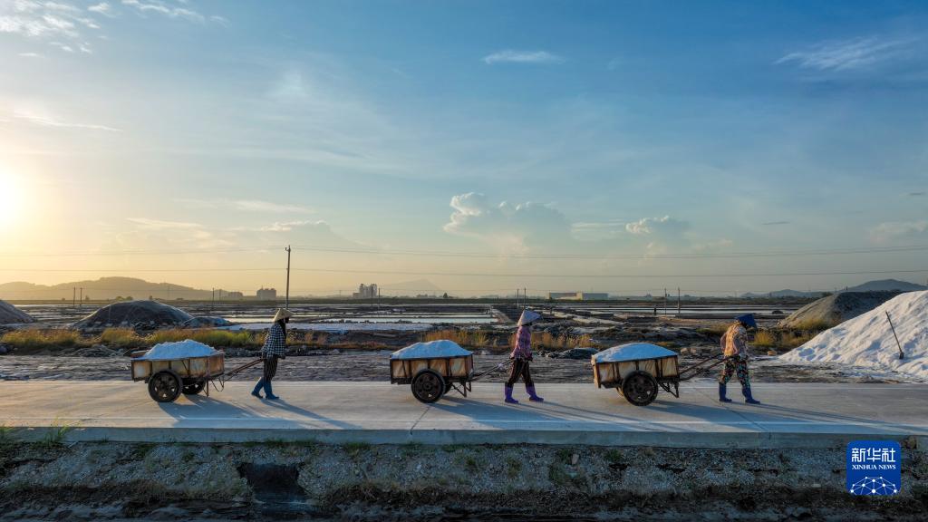 8月26日,在福建省莆田市秀屿区东峤镇的莆田盐场,工人们在运输海盐(无人机照片)。