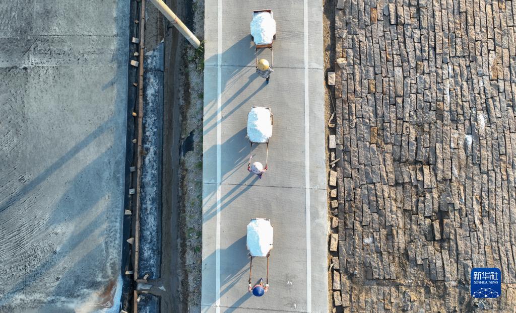 8月26日,在福建省莆田市秀屿区东峤镇的莆田盐场,工人们在运输海盐(无人机照片)。