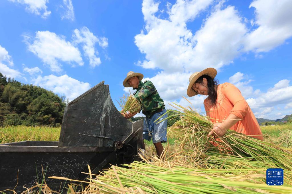 连日来,湖南张家界市永定区合作桥乡种植的水稻进入成熟收割期,当地农民加紧收割,确保颗粒归仓。
