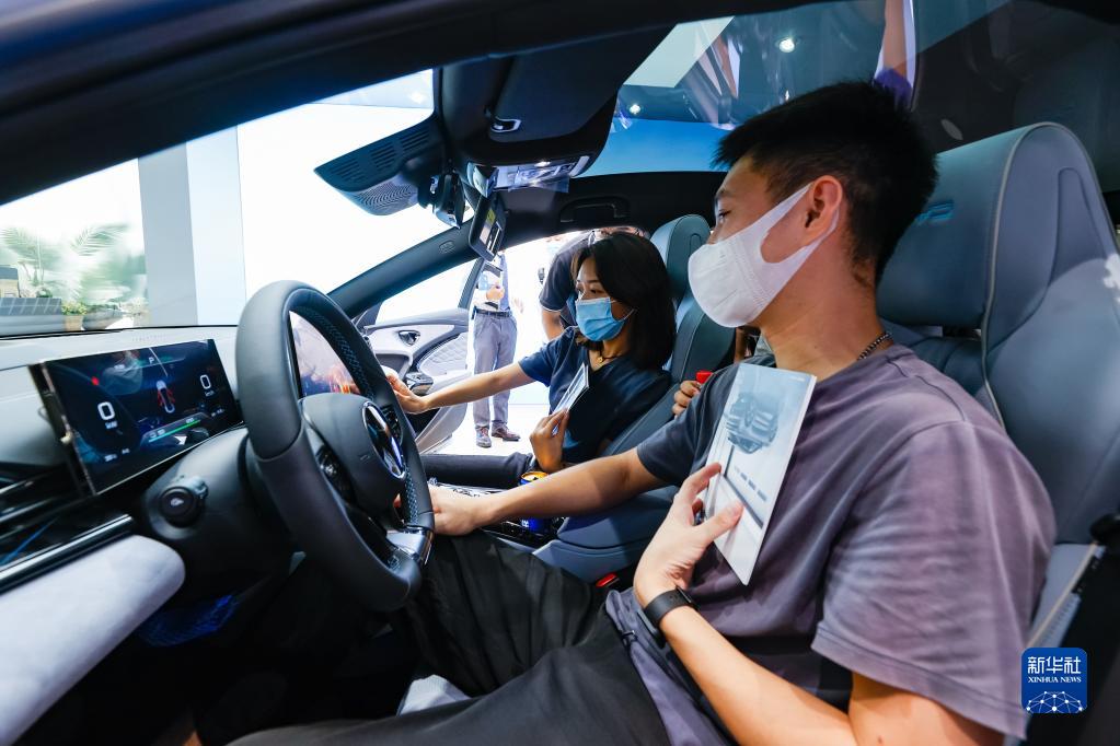 8月26日,在第二十五届成都国际汽车展览会的比亚迪汽车展台,参观者在体验比亚迪海洋网纯电动汽车“海豹”。