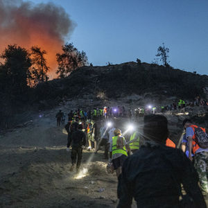 8月25日晚,在山顶隔离带,救援人员和志愿者严阵以待。新华社记者 王全超 摄