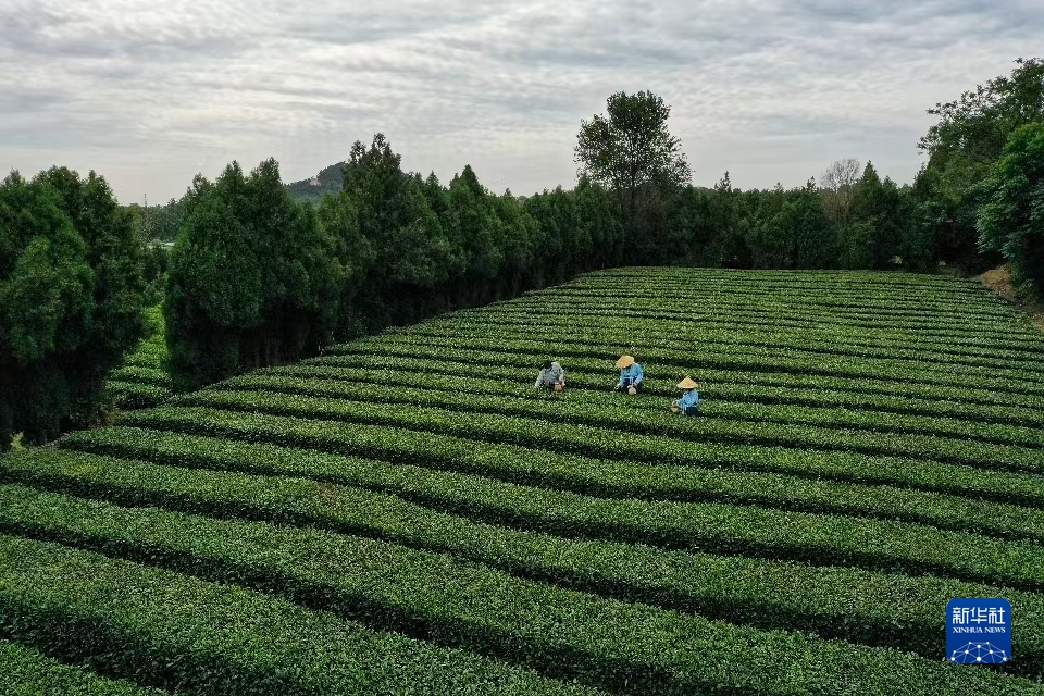 8月28日,在日照市天台山风景区生态茶园,游客体验采茶(无人机照片)。