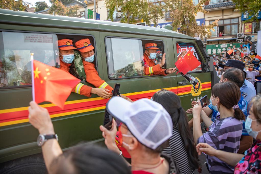 大家向消防队员喊着,难掩激动之情,不少人上前与他们握手,队员们也挥手致意,一些人流下了激动的泪水。