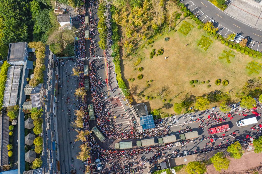 送别的队伍从校内延伸至校外,双向四车道的天生路上,重庆市民们敲响锣鼓,用各自的方式表达感谢之情。