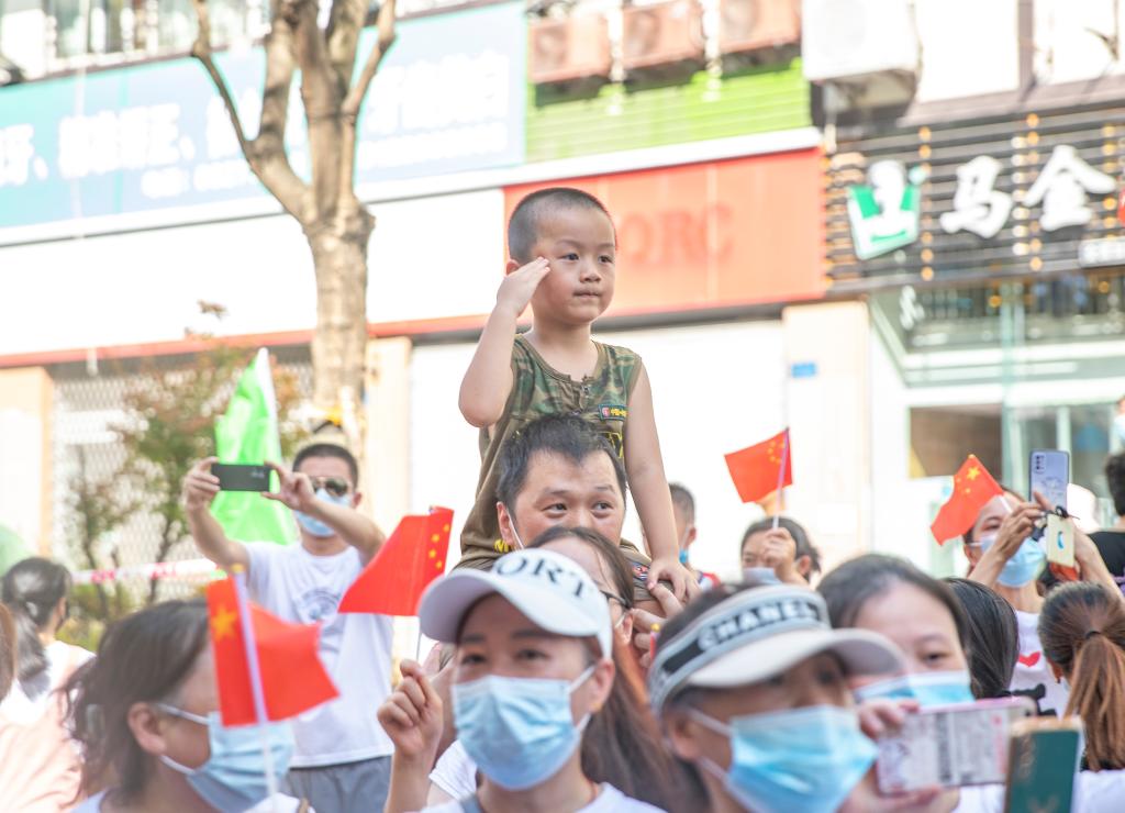 小朋友骑在爸爸的肩膀上,敬着不太标准的军礼,迟迟不肯放下。