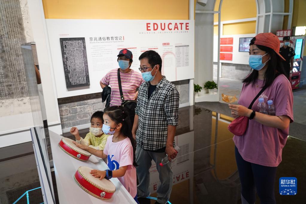 8月28日,儿童在北京鼓楼一层体验击鼓。